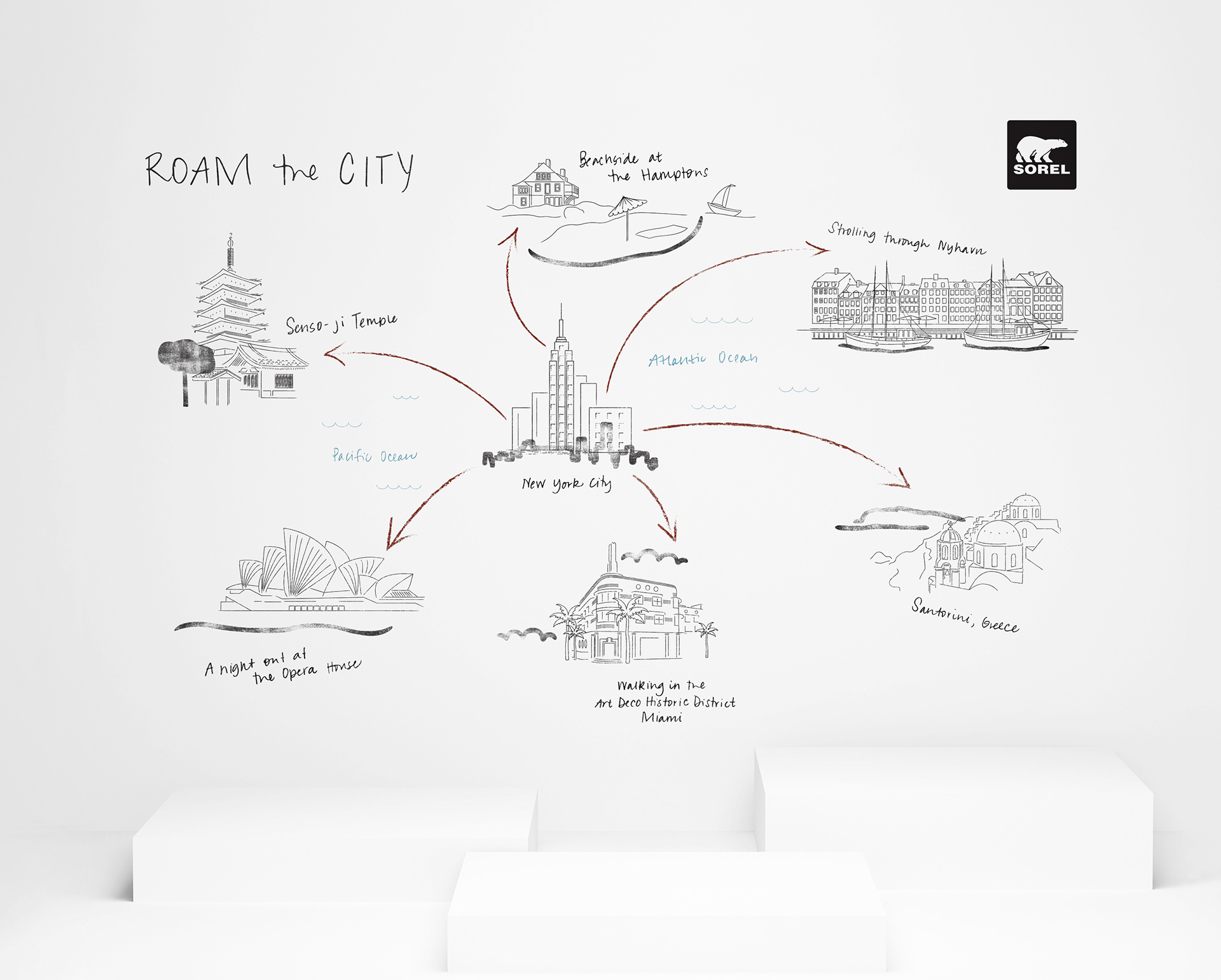 A large map of world destinations perfect for wearing the new spring line to. Used as a backdrop for the new styles in the New York showroom.